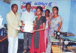 | Mr.M.David Ratnam,President of RAS giving certificates to the trained students in Tailoring and Embroidery work. Who are successfully completed the six moths training .supported by NCLP-RAS |